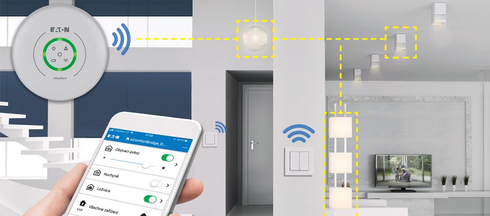 RF xComfort Bridge je chytrá ovládací jednotka osvětlení, která umožňuje komfortní spínání a stmívání osvětlení pomocí smartphonů. Snadná instalace a připojení přes LAN k routeru zajišťují bezproblémové ovládání až čtyř zařízení současně.