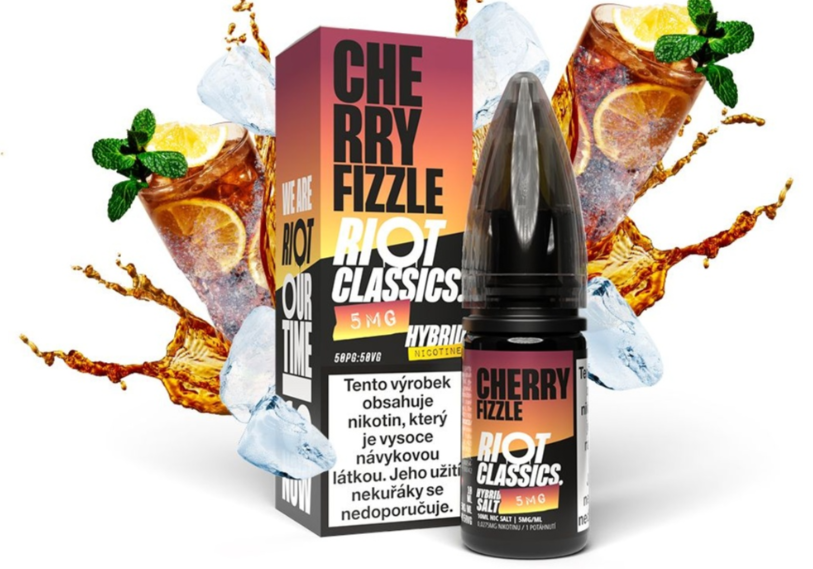 Riot Hybrid Salt Cherry Fizzle, lahodný třešňový e-liquid s nízkým obsahem nikotinu 10 mg, vhodný pro začínající vapeře i zkušené nadšence.