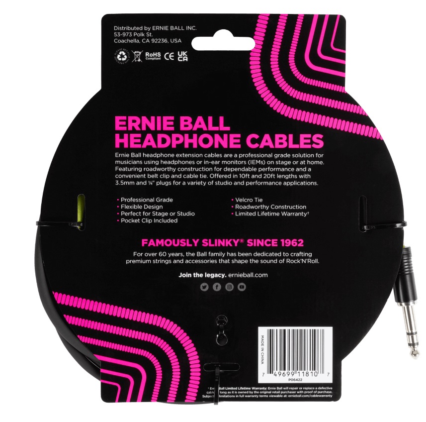 Ernie Ball Headphone Extension Cable 1/4 to 3.5mm 10' Black