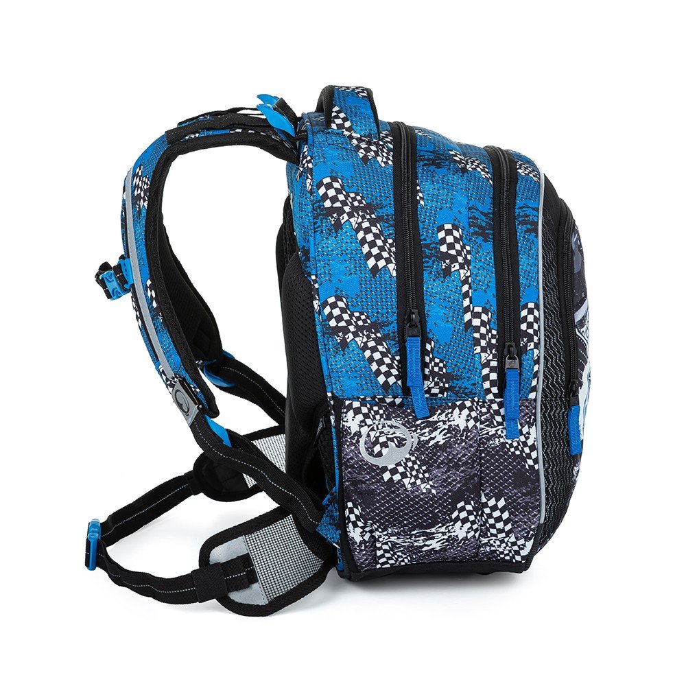 Bagmaster LUMI 23 D školní batoh - modré auto. Praktický a bezpečný batoh pro prvňáčky s novým zádovým systémem a reflexními prvky.