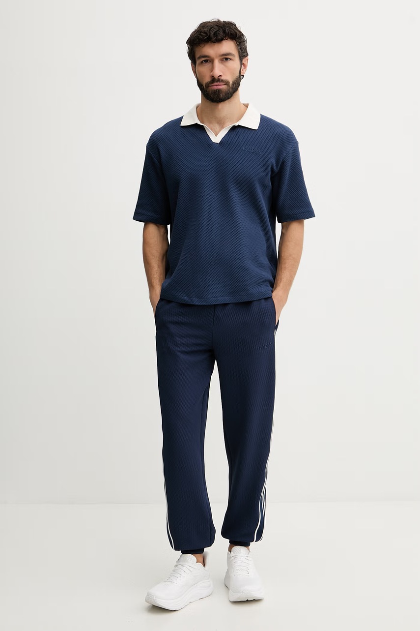 Tepláky Guess pánské - tmavě modré, pohodlné a volné, ideální pro každodenní stylizaci. Užijte si ležérní styl s našimi kvalitními tepláky.