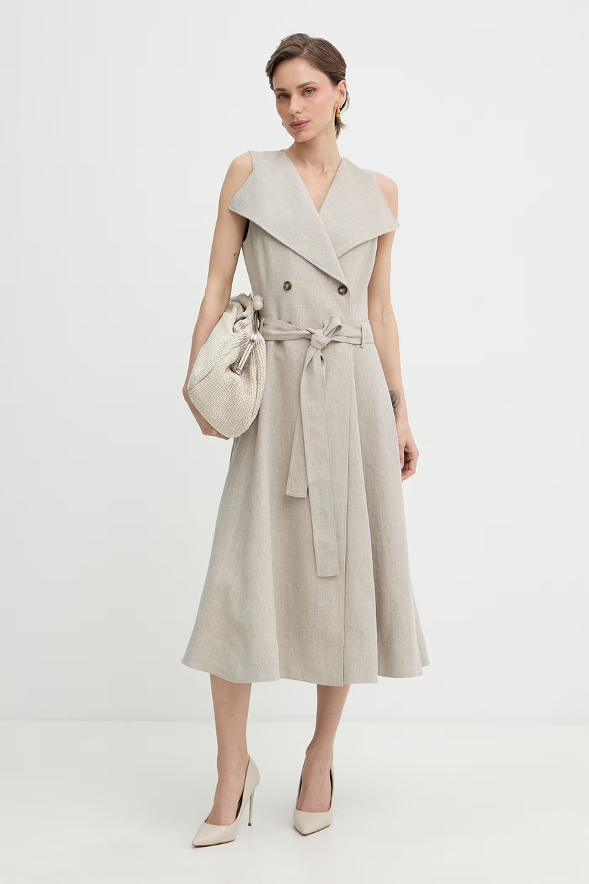 Elegantní midi šaty BOSS z lněného materiálu s klasickým límečkem a praktickým zapínáním na knoflíky. Perfektní volba pro kancelář, obchodní schůzky nebo méně formální příležitosti.