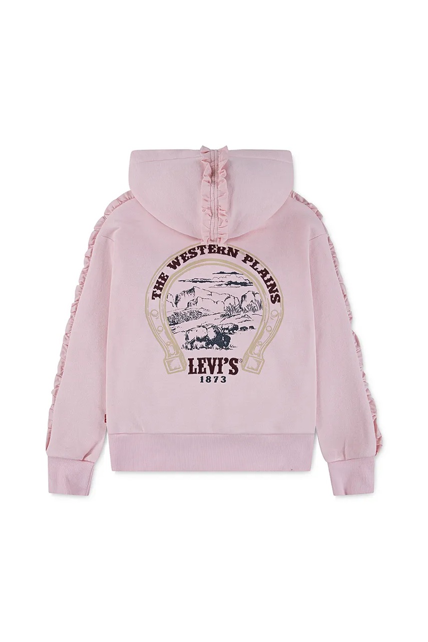Dětská mikina Levi's PULLOVER HOODIE WITH RUFFL je stylovým kouskem, který kombinuje pohodlí a trendy design. S kapucí a originální aplikací se stane oblíbeným kouskem každého malého módního nadšence.