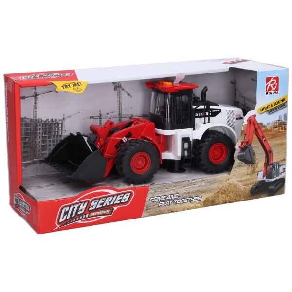 Nakladač s efekty na setrvačník. Velikost 30 cm. Vydává světelné a zvukové efekty. Aktivace tlačítky na střeše. Zvuky couvání, troubení, startování motoru, pohyby nakladače. 3xAG13 baterie, součástí balení Věk: 3+