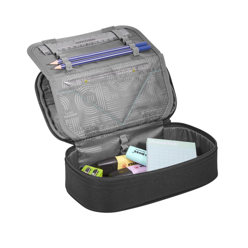 Jednopatrové školní pouzdro se dvěma klopami. Díky gumovým úchytům se do nich vejde celkem dvacetjedna pastelek, tužek a fixek. Tři širší úchyty poslouží na pravítko, kružítko či nůžky. Dva větší na gumu a ořezávátko. Penál…