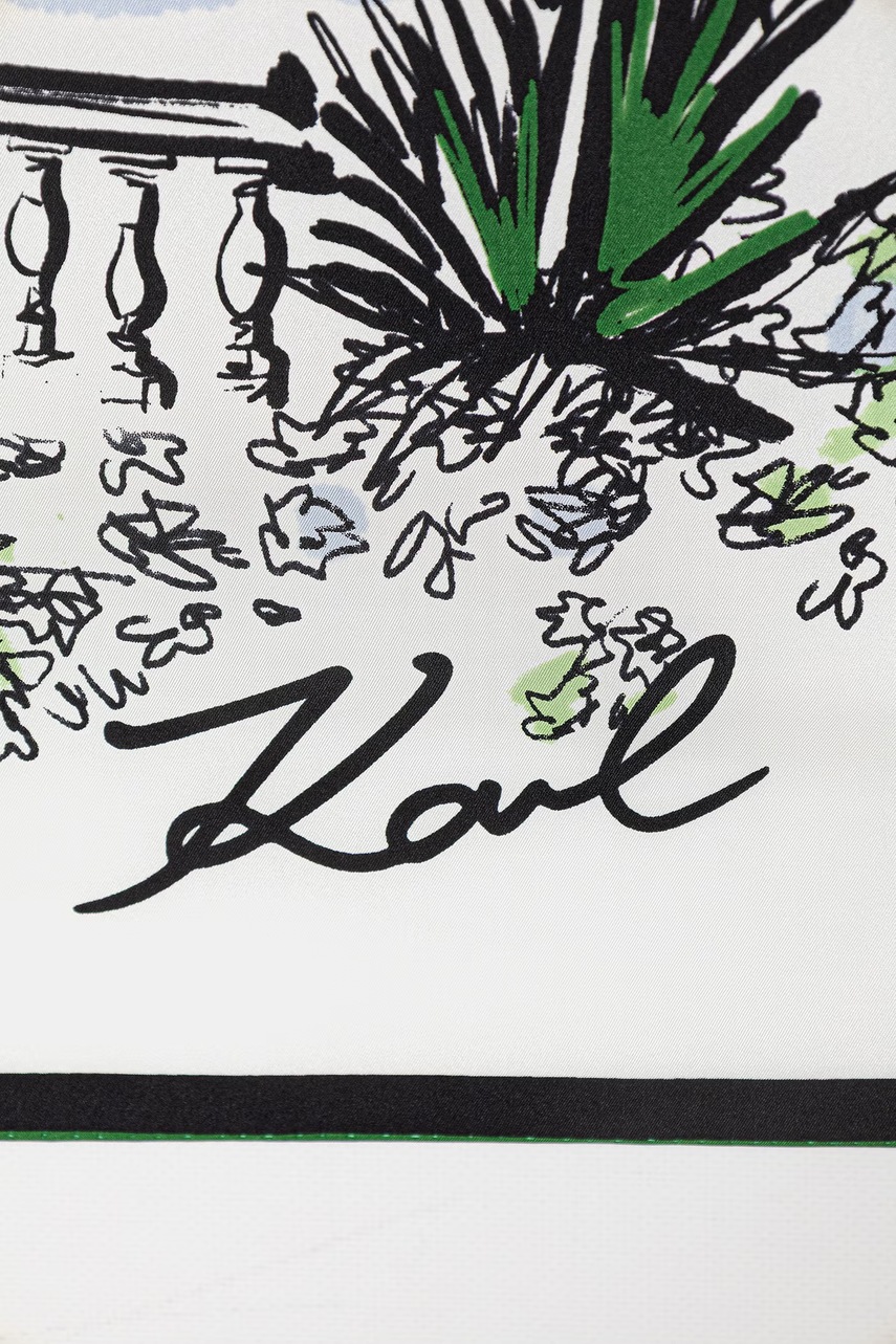 Krásný bílý hedvábný šátek Karl Lagerfeld, ideální pro teplejší měsíce. Univerzální charakter a sofistikovaný nádech. Vyroben z jemného hedvábí.