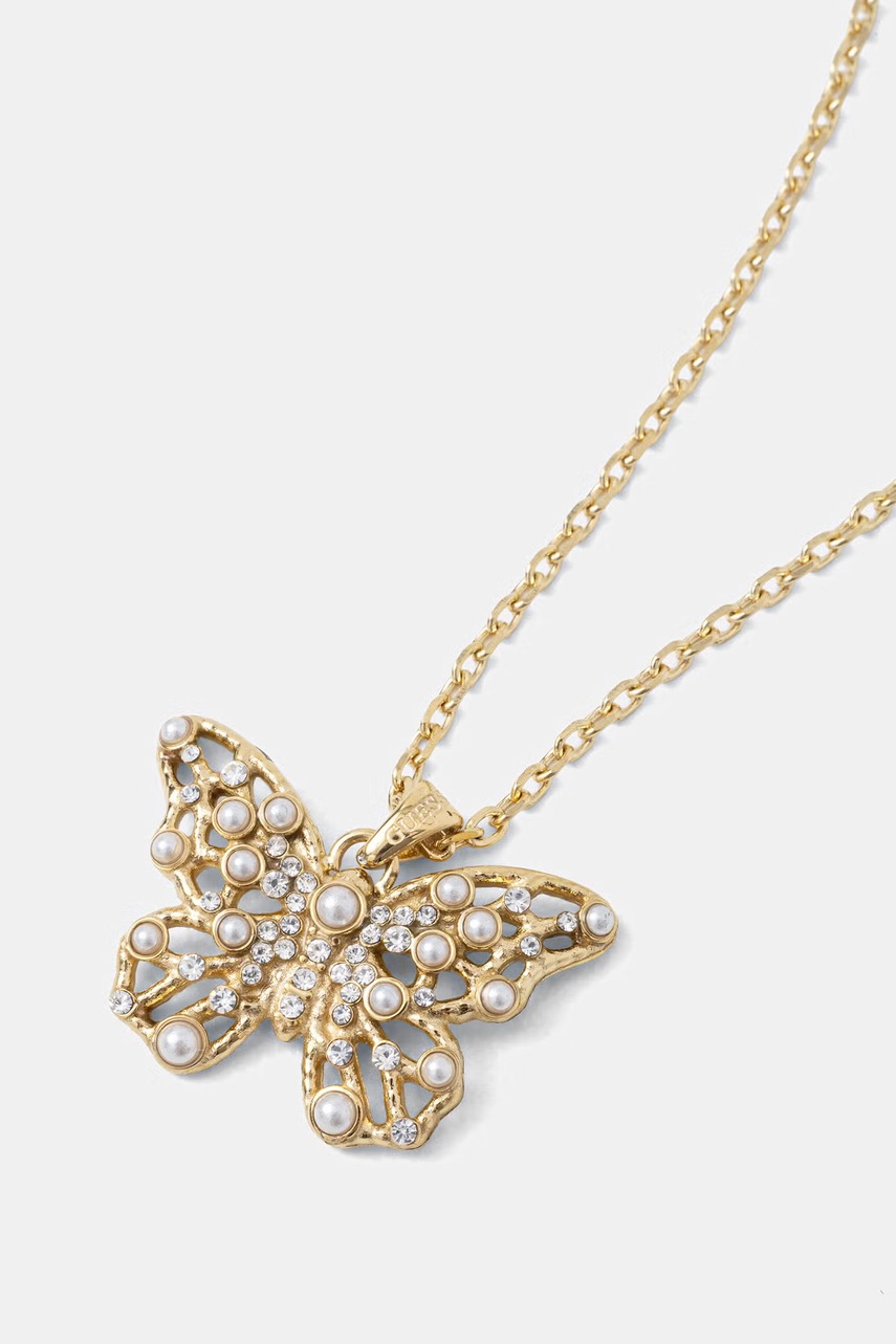 Dámský náhrdelník Guess s přívěskem z nerezové oceli Borboleta - sofistikovaný doplněk ke každodenním i elegantnějším outfitům. Motýl a jemné perly dodávají decentní lesk a klasický styl s ležérním šarmem.