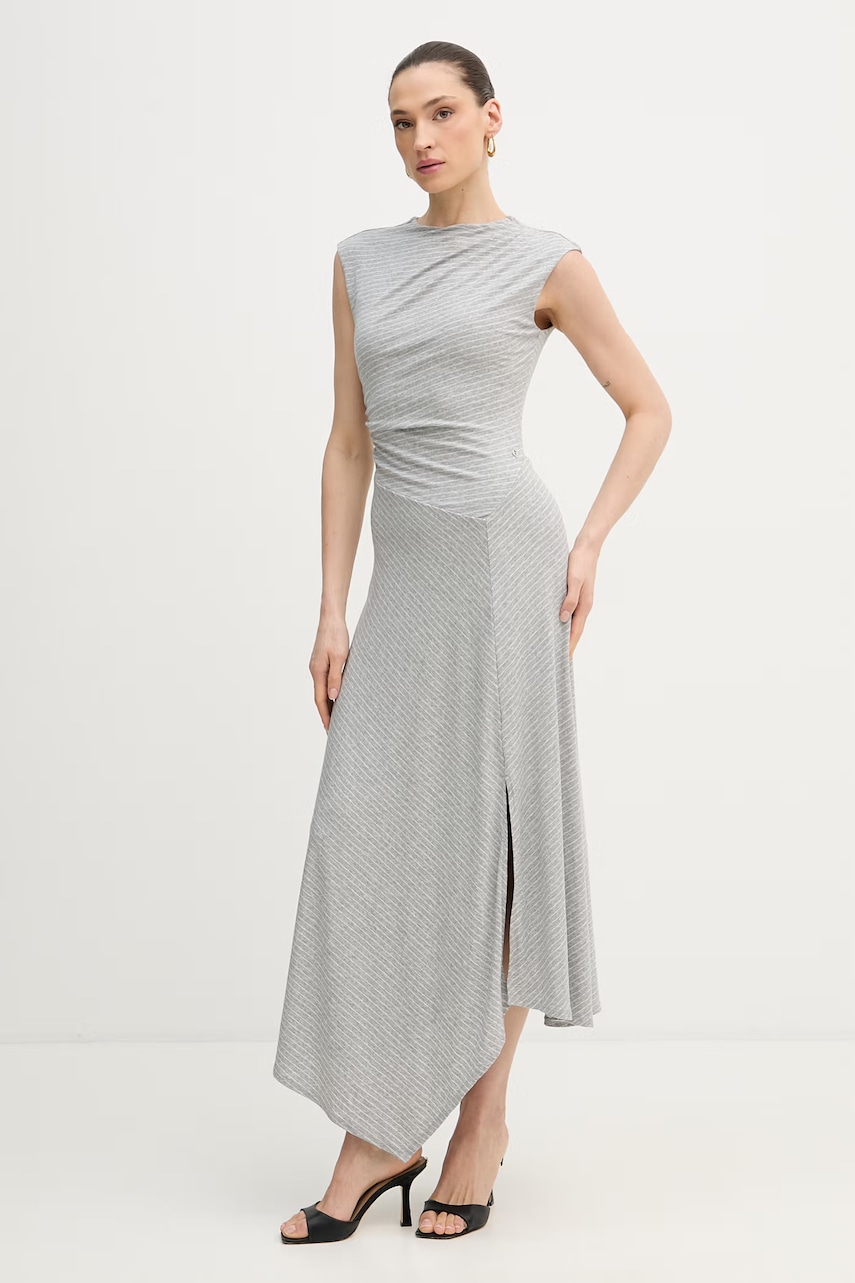 Šedé úpletové šaty Guess s rozšířeným střihem, kombinující pohodlí a eleganci.
