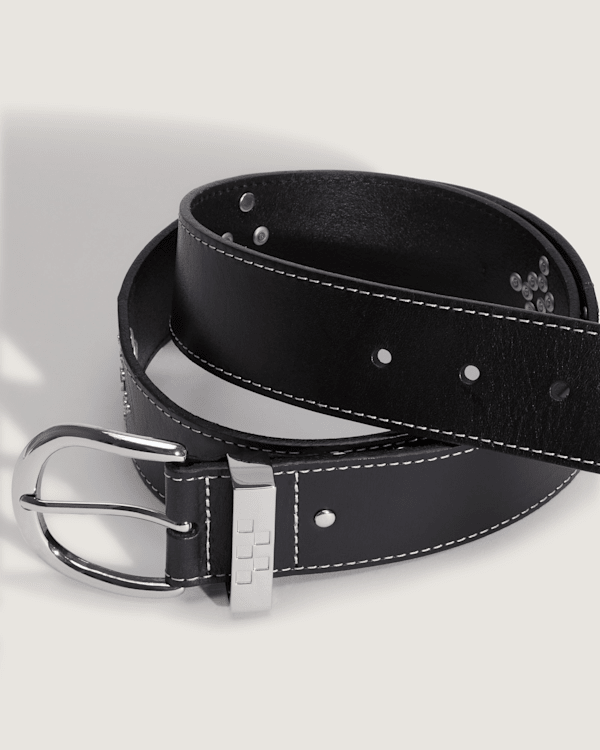 Vans Premium Studded Belt je černý pásek vyrobený z plnozrnné kůže, zdobený cvočky a kameny, s čtvercovou sponou pro každodenní nošení.