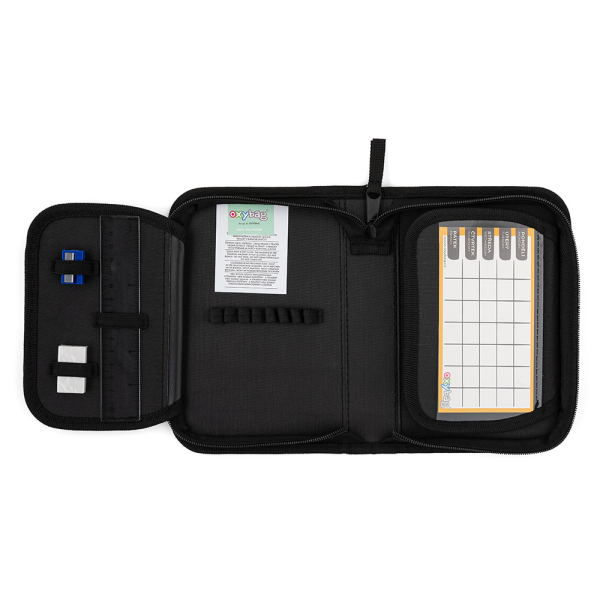 Jednopatrový školní penál se 2 chlopněmi řady UNICOLOR, prázdný obsahuje 25 gumových poutek pro uchycení psacích potřeb. na vnitřních chlopních jsou průhledné fólie pro rozvrh hodin.
