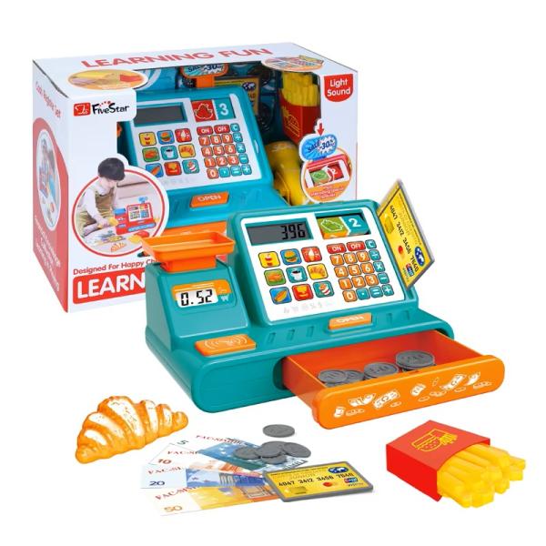 Pokladna. Velikost 26x13x17 cm. 2xAA baterie nejsou součástí. Věk: 3+ Obsahuje pokladnu s výsuvným šuplíkem na mince, displejem a funkční kalkulačkou, potraviny, mince, kreditní kartu