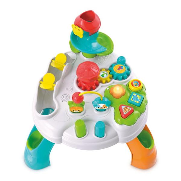Veselý hrací stolek s kostkami a zvířátky zabaví Vaše děti po dlouhou dobu. Hrací stoleček s mnoha aktivitami, jejichž cílem je stimulovat interakci s dítětem. Vkládací tvary se světly a zvuky, otáčející se ozubená kolečka…