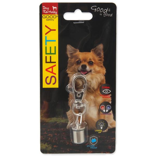 Svítící přívěsek na obojek pro psy viditelnost až 300m vyrobeno z odolného kovu 2 barvy blikání (červená a modrá) snadné uchycení k obojku pomocí karabinky odolný proti stříkající vodě Součástí balení je 1 sada baterií.