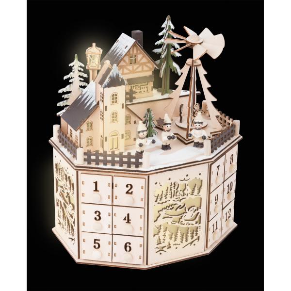 Kouzelná vánoční krajinka. Tento detailní adventní kalendář nadchne krásným designem nasvícených historických budov ve vánočním městečku. Po stranách jsou nejen očíslované šuplíčky, ale také vyřezávané obrázky, které jsou také nasvíceny. Baterie nejsou součástí balení. Hlavní…