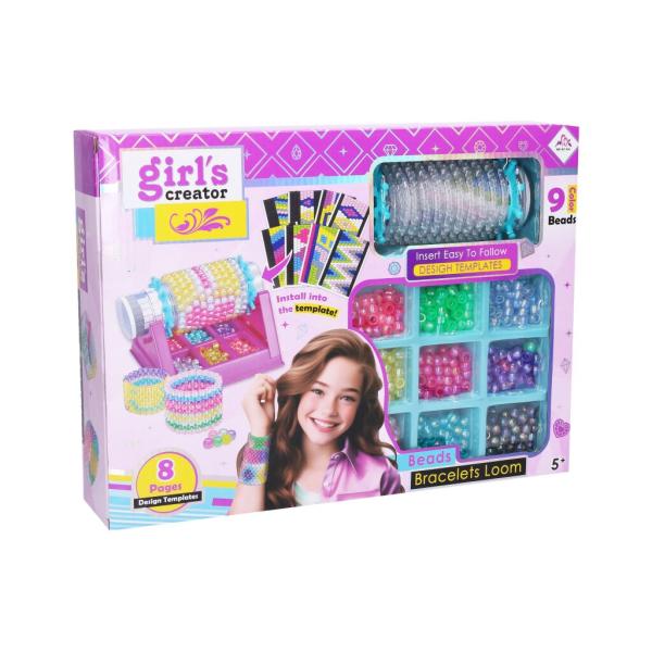 Tvorba náramků s navlékačem. Obsahuje navlékač na tvorbu náramků, šablony se vzory, různé barvy korálků.