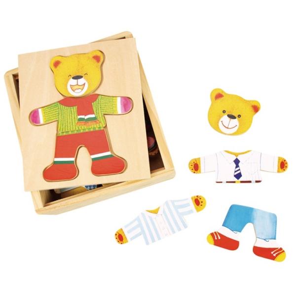Dřevěné oblékací puzzle obsahuje celou řadu pestrobarevných dřevěných dílků, včetně oblečení a tváří medvěda s různými výrazy. Jednotlivé díly se skládají na destičku, která zároveň slouží jako víko krabičky. Praktická krabička pro uložení všech dílků…