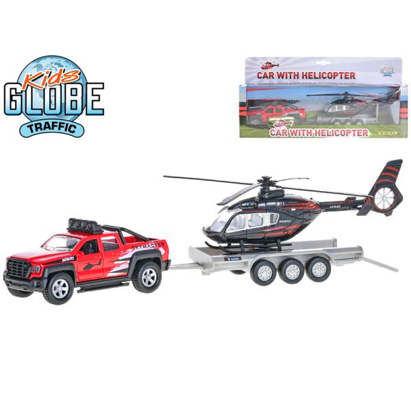 Kids Globe Traffic auto terénní 13cm kov na zpětný chod s přívěsem + helikoptéra 20cm