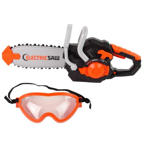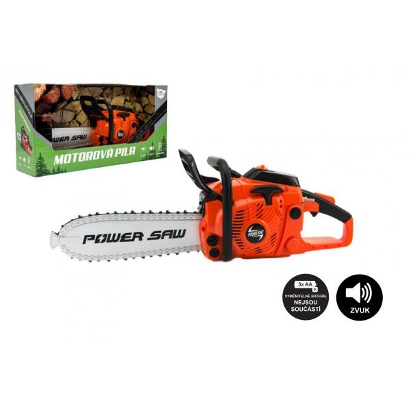 Motorová pila 34 cm a ochranné brýle. 3xAA nejsou součástí. Vydává zvukové efekty. Aktivace tlačítkem na levé straně.