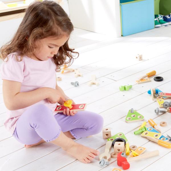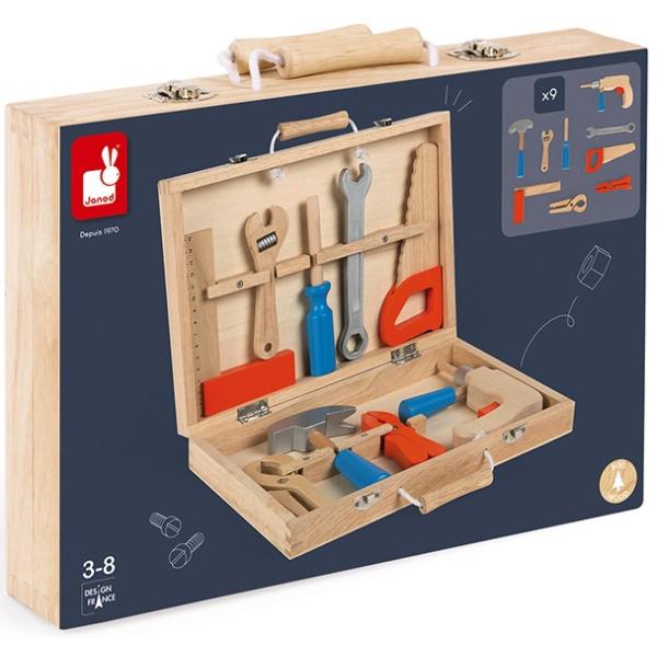 Krabička, která obsahuje vše potřebné pro začínající kutily. Snadno se přenáší díky svým malým dřevěným držadlům Obsahuje 9 nástrojů Vhodné pro děti od 3 let