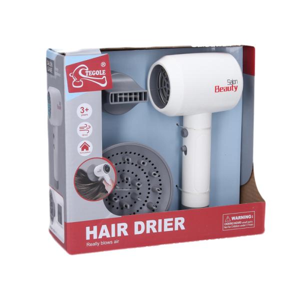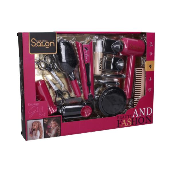 Kozmetický set s fénem. Velikost fénu 14cm. Věk: 3+ 2xAAA baterie nejsou součástí. Obsahuje: fén, hřeben, zrcadlo, nůžky, stojací zrcadlo, sadu štětců.