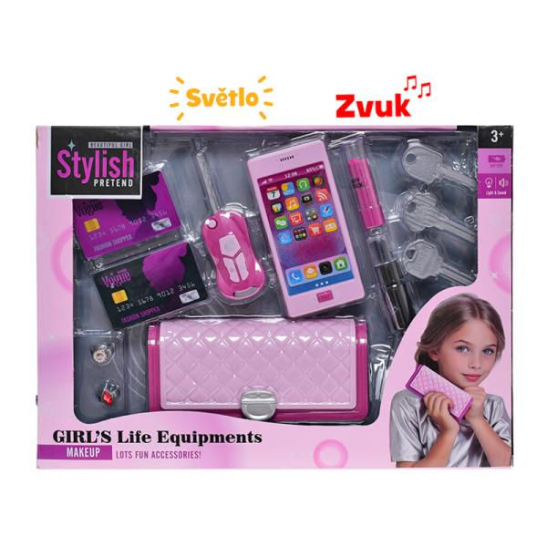 Kabelka s doplňky, se světlem a zvukem. Rozměr: - 18,5 x 8 cm Materiál: plast Na baterie: 5x LR41, AAA (jsou součástí balení) Balené v krabičce. Věk: 3+