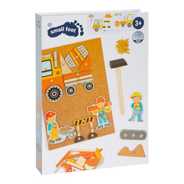 Doprava je zábava! Zatloukačka s kladivem a špendlíky. V balení naleznete korkovou desku, kladivo, připínáčky a dřevěné objekty různých tvarů. Děti si mohou na desce/nástěnce díky zatloukačce vytvořit různé obrázky. Ať je to stavbař, míchačka…