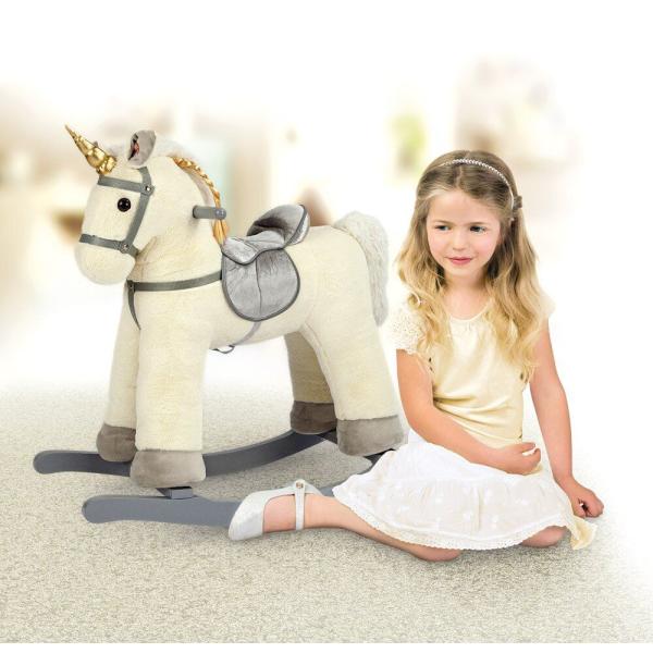 Plyšový jednorožec houpačka, bílý. Lyžiny a ruční madla jsou z topolu. Látkové sedlo zajišťuje pohodlné sezení malých dětí a je připevněno suchým zipem. Jízda na koni přináší malým dětem spoustu zábavy a trénuje pocit rovnováhy…