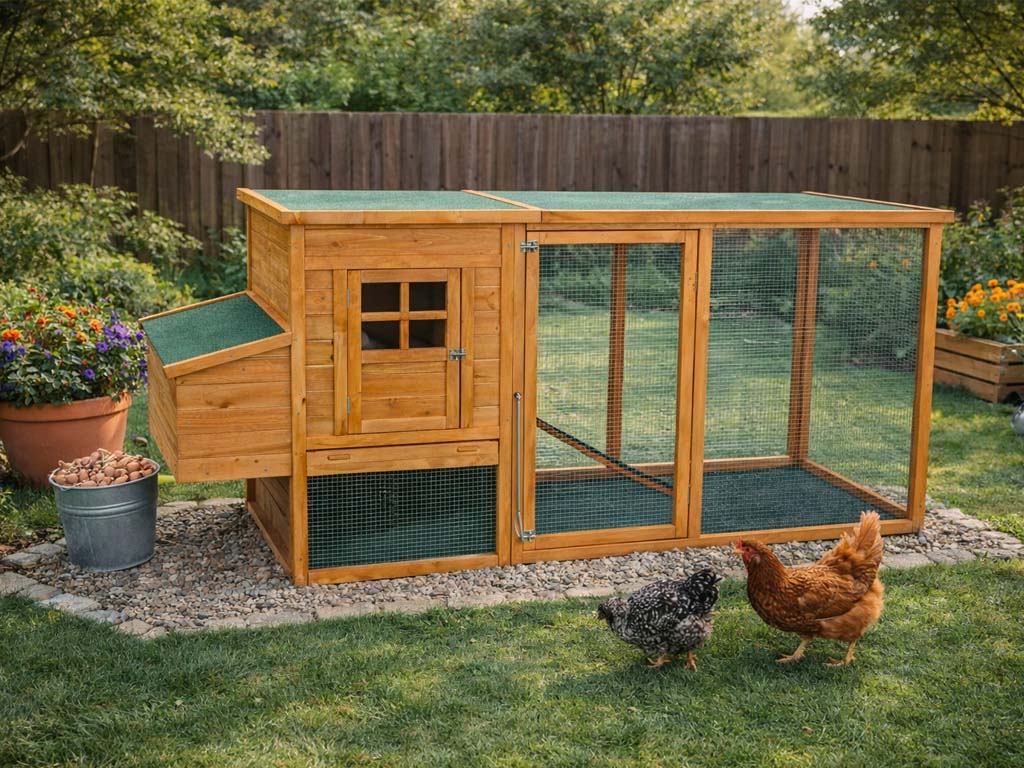 Dřevěný kurník Kenniva Rusty je ideálním domovem pro 4-5 slepic. Prostorný výběh poskytuje ochranu před predátory a umožňuje slepicím hrabání.