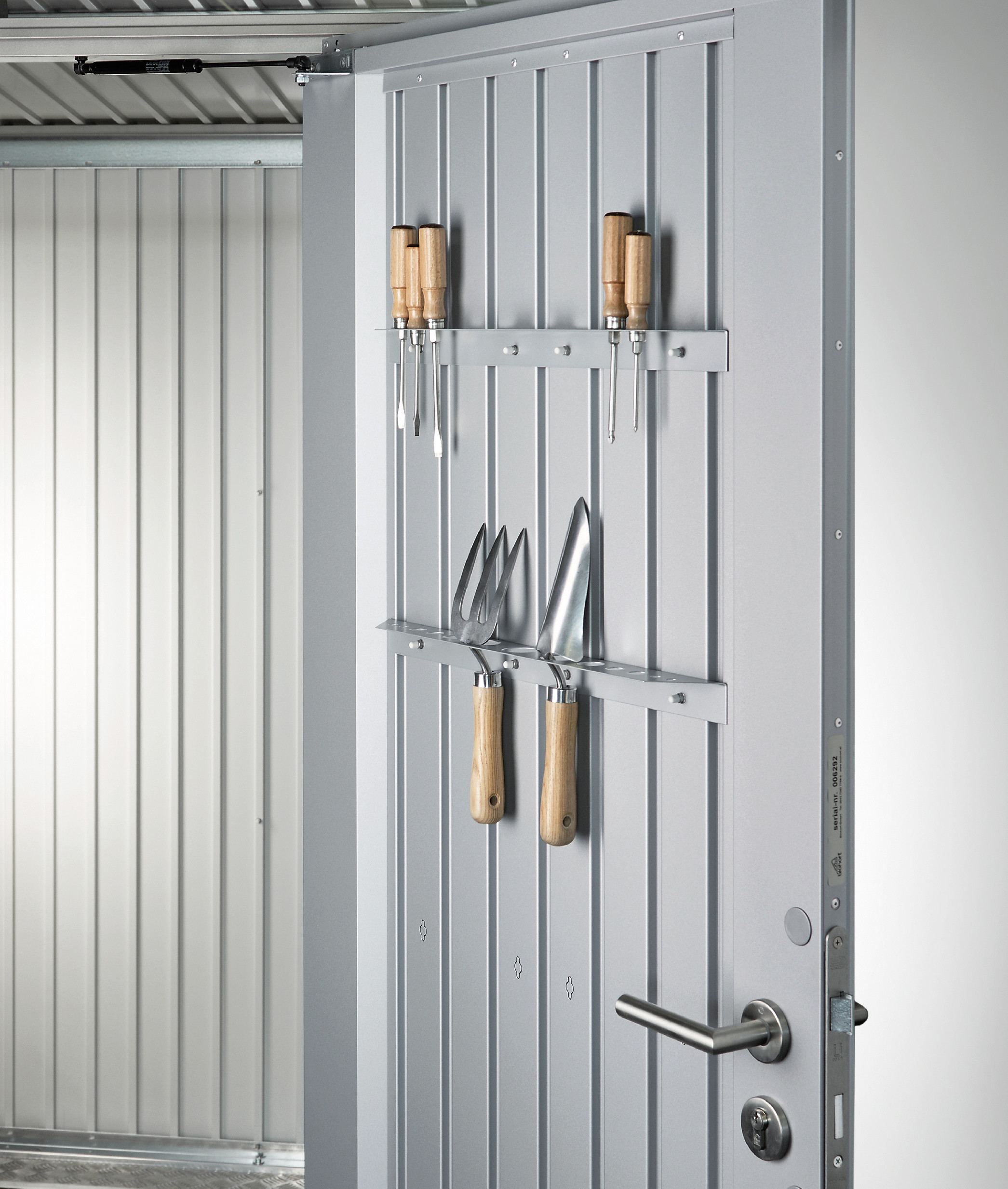 Zakázkový kovový domek na nářadí AvantGarde Eco A4 s dvoukřídlými dveřmi a tmavě šedou metalizací. Ideální pro uskladnění jízdních kol, potřeby k bazénu a zahradní sekačky.